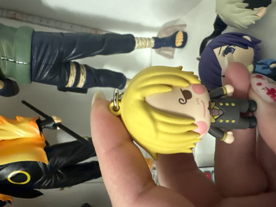A human hand, featuring light skin and manicured fingernails with red and white decorative elements, holds a small, yellow-haired chibi-style figurine in the foreground. The figurine, identified as Sanji from One Piece, is dressed in a black double-breasted suit, displays pink cheek blush, a subtle smile, and a prominent brown swirl representing an eyebrow, with its left eye obscured by hair. A silver keyring is visibly attached to the top of the figurine's head. The background is an indoor setting, appearing as a light-colored display area or shelf for collectible items. Blurred, larger anime figurines are arranged behind the held item. To the upper left, a portion of a Naruto Uzumaki figurine, characterized by a black outfit and an orange/yellow flame-like cape, holds a black staff. To the upper right, a Kakashi Hatake figurine stands, identifiable by its green vest, dark blue pants, and leg wraps. In the lower right background, a purple-haired chibi-style figurine, recognized as Touka Kirishima, lies on its side, adjacent to another partially visible grey-haired chibi figurine. The location in Plovdiv, Bulgaria, is not discernible from the image.
