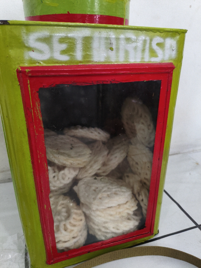 The image displays a brightly colored, rectangular snack container, located in Muka, Indonesia. The container is painted lime green, featuring a prominent red frame around a clear window on its front. Above this window, the white stenciled text "SETIA MISA" is visible. The upper part of the container is a cylindrical section, also green with a red horizontal band. Inside the clear window, numerous light-beige, textured, circular food items, consistent with krupuk or crackers, are tightly packed. The container is positioned on a white tiled floor with dark grout lines. A brown fabric strap is partially visible in the lower right foreground. The background behind the container is a plain, light-colored surface. No people or active interactions are visible in the scene.