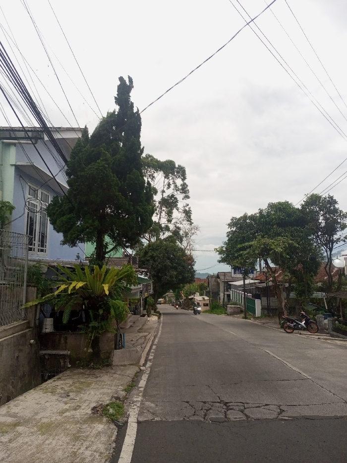 A quiet, uphill street lined with trees and buildings. On the left, a blue-painted house is partly obscured by a tall, dark green tree and lush vegetation. Utility wires crisscross the sky above. A motorbike is parked on the right side of the road. In the distance, another motorbike moves uphill. The road surface shows signs of wear. The sky is overcast.