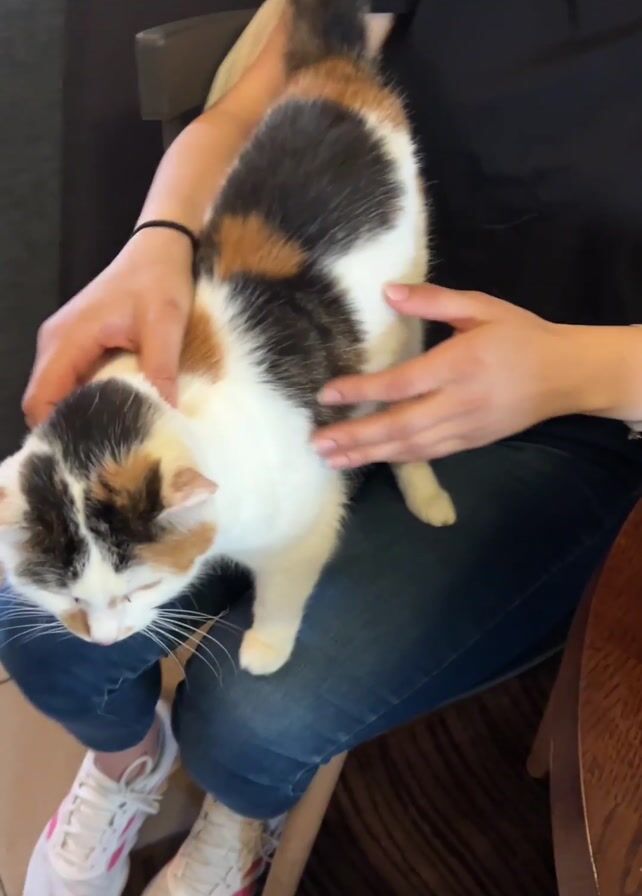 - "A person sitting on a wooden chair is petting a cat sitting on their lap" by FM-rvsVv2, licensed under CC BY 4.0