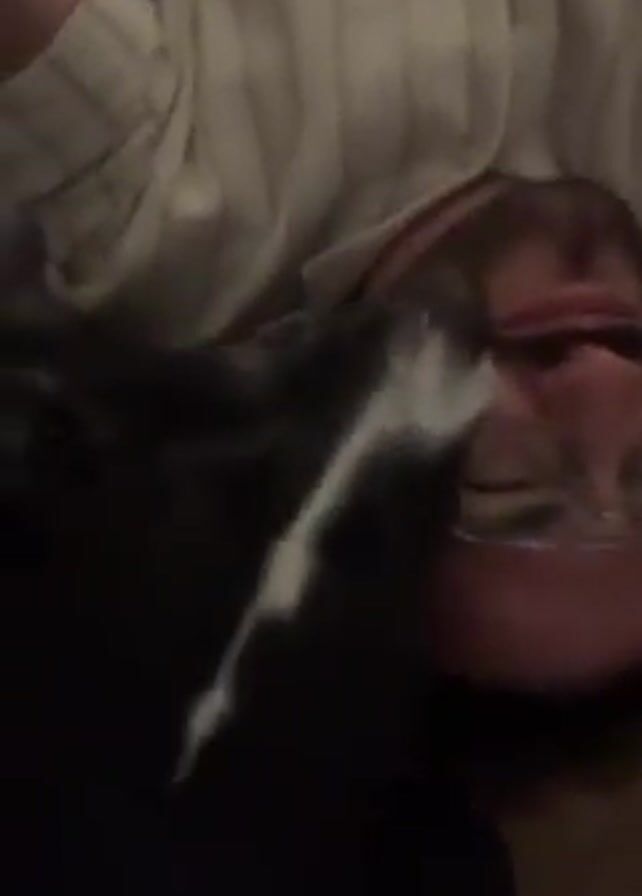 person lying on their back, smiling, with a black and white dog jumping on them. The person has a beard, glasses, and is wearing a striped shirt. The dog is small and appears to be playing with the person. The setting appears to be indoors on a wooden floor. There is a charger plugged in nearby. The camera is close to the person's face and angled from above.