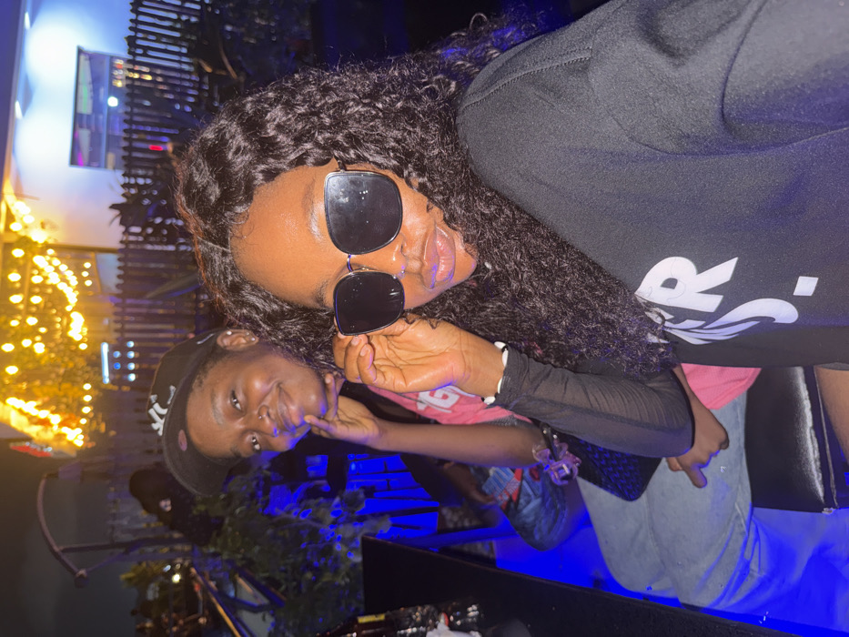 Two people are visible, one in the foreground and one slightly behind and to the left. The person in the foreground has curly hair and is wearing sunglasses and a black shirt with white lettering. The person behind has a baseball cap and is smiling, resting their chin on their hand. Blue lighting is visible, and in the background, there are some lights that look like Christmas lights. The image appears to be taken at night.