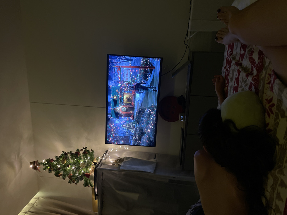 A couple is watching a Christmas movie on TV in a dimly lit room. A small Christmas tree decorated with lights sits on a table below the TV. The scene displays festive Christmas lights and a building labeled "Santa's Workshop." A red wall-mounted speaker is near the TV. The couple is lying in bed covered with a patterned blanket, with one person visible from the back.