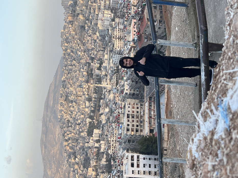 A panoramic image depicts a young male subject standing on an elevated overlook, smiling and presenting a "thumbs-up" gesture with both hands towards the viewer. He is dressed in a black hooded tracksuit and black sneakers with white soles. Immediately in front of him is a metal railing, consisting of an upper blue-painted bar and a lower black-painted bar, supported by vertical posts. The ground in the foreground consists of loose earth mixed with white and blue fibrous or plastic debris. The midground showcases the densely populated urban landscape of Qudsaiya, Syria, extending across hilly terrain. Numerous multi-story residential and commercial buildings, predominantly light-colored, are tightly clustered. A prominent white mosque minaret is visible within the city. In the background, a range of arid, rocky mountains stretches across the horizon. A cluster of communication towers is discernible on one of the distant mountain peaks. The sky is clear and light blue, indicating daylight conditions, likely late afternoon due to the soft, directional illumination on the city.