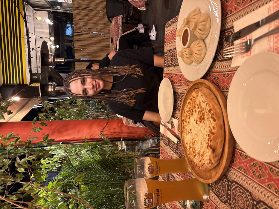 This image captures a nighttime scene at an outdoor restaurant in Givatayim, Israel. A young woman with long, dark braided hair, wearing a black t-shirt, is seated at a table in the foreground, smiling directly at the camera. The table is covered with a patterned red, white, and brown tablecloth. On the table are two glasses of Weihenstephan beer, a round wooden board holding a cheese-topped flatbread (Khachapuri), and a white oval plate with five dumplings (Khinkali) surrounding a small bowl of dark sauce. Two empty white dinner plates and a set of silverware are also present. In the background, lush green plants, a red structural pillar, and a bamboo-style fence are visible. Overhead string lights and two patio heaters provide illumination. A second individual is partially visible in the background, seated at another table.