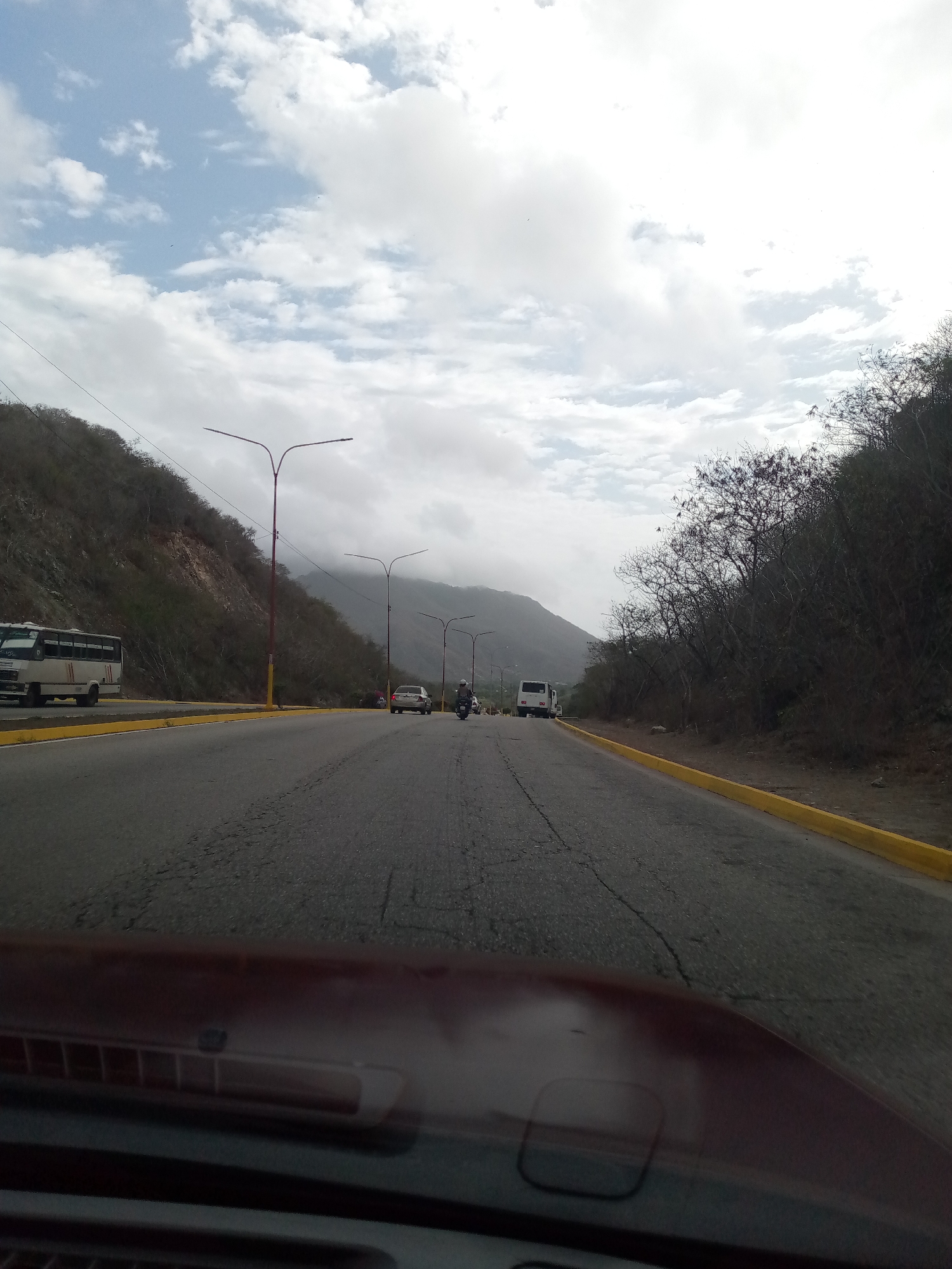 view from inside a vehicle, looking out onto a cracked asphalt road in La Asuncion, Venezuela. The road stretches into the distance between hills covered in sparse vegetation. Yellow curbs line both sides of the road. Several vehicles are visible further down the road, including a white bus and a motorcycle. Tall streetlights with red poles are spaced along the roadside. The sky is cloudy.