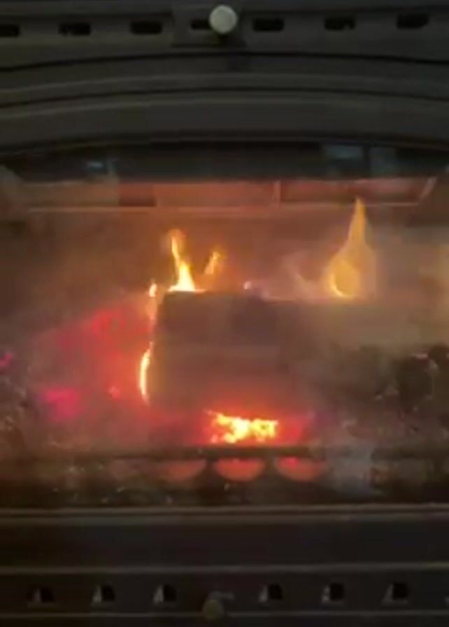 wood-burning stove with a fire visible behind a glass door. Flames are actively burning around logs, and embers glow at the bottom of the stove. The stove is made of a dark metal, possibly cast iron, with a door handle and a row of small rectangular vents at the bottom. The glass door has some smudging, obscuring the view slightly. The surrounding environment is not visible. There is audible speech, likely unrelated to the visual content.