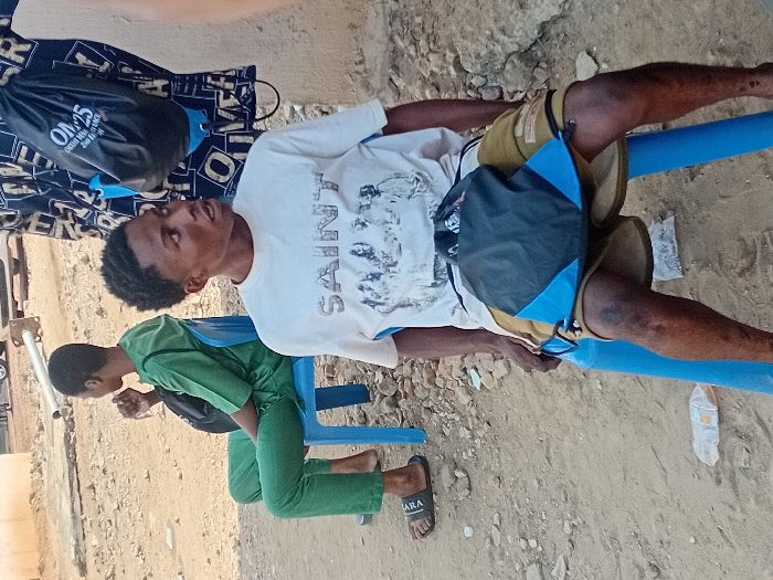 Two people sit outdoors on blue chairs. The person in the foreground wears a white t-shirt with an image of what appears to be a band on it, khaki shorts, and slides. They have a black backpack on the back of their chair. The other person wears a green top and pants, with black shoes, and a black backpack. They are sitting on the chair with a bent back and looking at the ground. The background includes dirt and some walls.