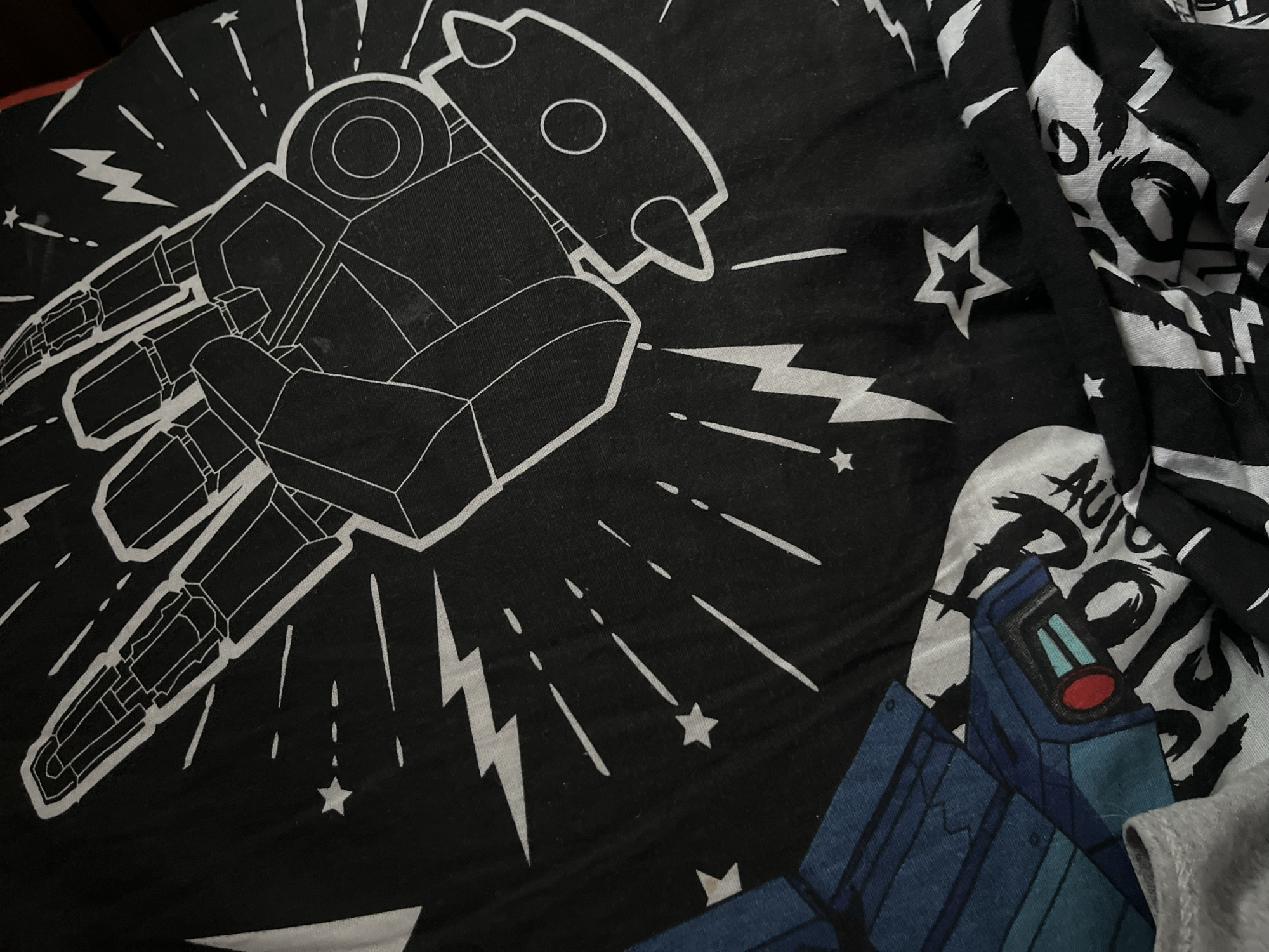 The image depicts a close-up of a black and white patterned fabric. Prominently featured is a design resembling a robotic hand or mechanical claw grasping a rocket ship. Surrounding this central motif are graphic elements such as stars, lightning bolts, and radiating lines. In the lower right corner, there is a partial glimpse of another design element, possibly featuring the word "AUTO" above a blue shape with a red dot. The fabric appears wrinkled and folded, indicating it is likely a piece of clothing or a textile item. The image contains no information that can be used to derive a location.