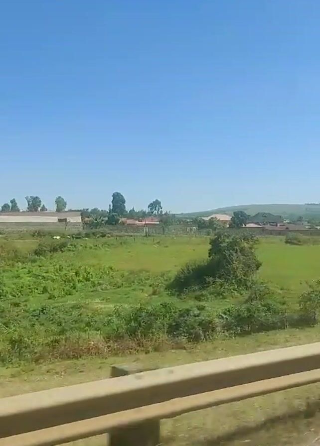 rural landscape under a clear blue sky, captured from a moving vehicle