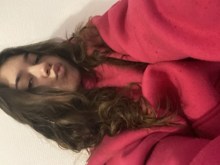 A single individual, appearing to be a young female, is depicted in a close-up indoor shot