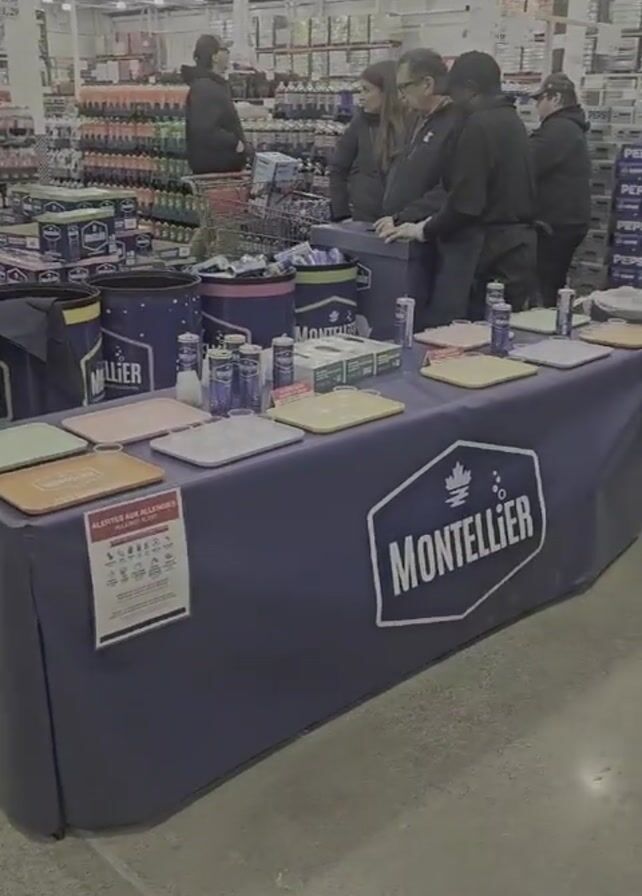 scene inside what appears to be a Costco or similar warehouse store. A display table covered in a dark blue tablecloth with the "Montellier" logo is in the foreground. The table has several small cans and colored trays on top, likely for product sampling. Behind the table, several people are standing and interacting. A few customers with shopping carts are seen walking down the aisle past the display. Stacks of merchandise and shelving units filled with products are visible in the background. The lighting is bright and artificial.
