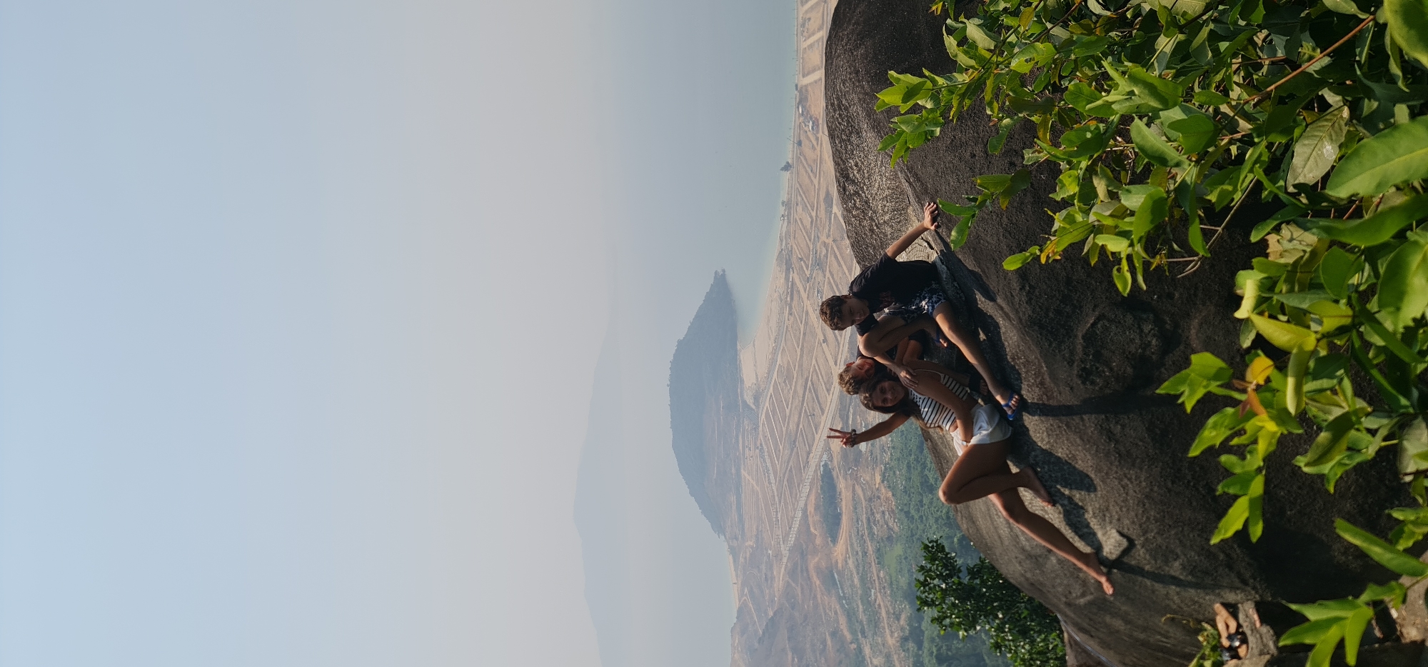 A panoramic shot shows three people positioned atop a large, dark rock formation covered with greenery, against the backdrop of a vast landscape