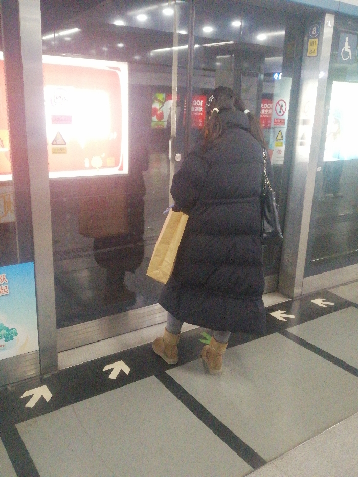 A subway platform is depicted in Xicheng District, China. A single individual is viewed from behind, standing on the light grey tiled platform facing a set of closed glass platform screen doors. The person wears a long, black, padded winter coat, light grey trousers, and tan, Ugg-style boots. Their dark hair is styled into two pigtails, each secured with a white hair tie and adorned with white hair clips. The individual holds a light brown paper bag in their left hand and carries a dark shoulder bag with a silver chain strap on their right shoulder. The platform floor features black lines sectioning the light grey tiles, with two prominent white directional arrows pointing towards the right, leading up to the doors. The glass doors reflect multiple brightly illuminated rectangular displays from the opposite platform, including one with a red background and a triangular warning symbol, and another with a dark silhouette of a person. Through the glass, inside what appears to be a subway car, red signs with white Chinese characters are visible, one featuring a "do not" symbol (red circle with a diagonal line). Above the doors on the right, a white sign displays "M1 B4" alongside a blue square containing a white wheelchair accessibility symbol and a white upward-pointing arrow. A vertical advertising poster with blue and green imagery is partially visible on the far left, behind the glass barrier.