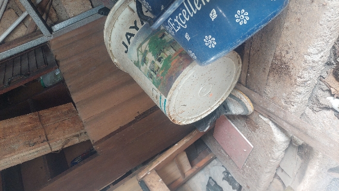 cluttered area, likely a backyard or storage space. The perspective is low, looking up at the scene. There is a large, white bucket, lying on its side, with "JAY" written on the side. The bucket has a faded image of a house and trees on it. A blue plastic container, marked "Excellent" and with a decorative floral design, is leaning against the bucket. Part of a pair of gray and white sneakers can be seen next to the bucket. There is a piece of wood and a wooden step, partially visible on the left side of the image. The ground is uneven and covered in dirt and debris. The location is in Cibinong, Indonesia at coordinates -6.481 latitude and 106.835 longitude.