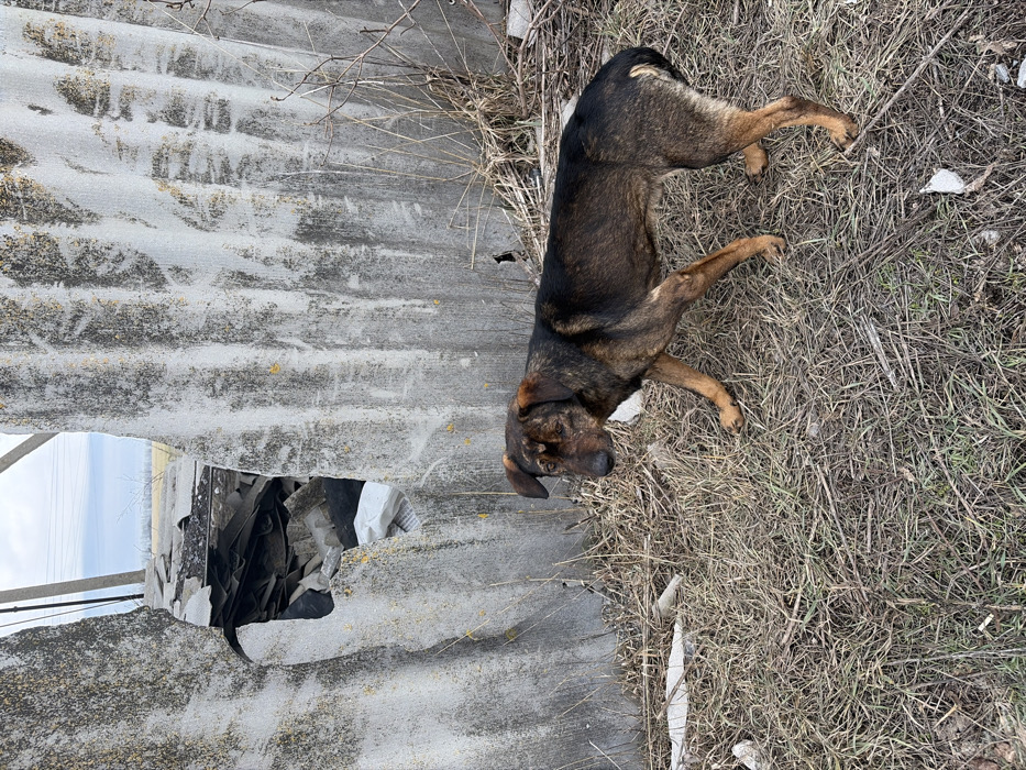 This image, taken in Bessergenovka, Russia, depicts a desolate outdoor scene. The primary subject is a medium-sized, short-haired dog, appearing to be a mixed breed, standing on a patch of dry, matted yellowish-brown grass and scattered debris. The dog is predominantly dark brown with tan/brindle markings on its head and legs, and appears lean, with visible ribs, suggesting a poor nutritional state. Its head is turned towards the left foreground, with its left front paw slightly lifted, indicating potential movement or a pause in walking. Behind the dog is a severely damaged, grey, corrugated barrier, likely constructed from asbestos cement or a similar material. This barrier spans vertically across the midground. A large, irregular hole is present towards the left side of the barrier, exposing a pile of dark and light-colored rubble, including what appears to be more corrugated sheets and a white plastic bag or sheet. The barrier's surface is weathered, showing dark vertical streaks and patches of yellow-green discoloration, possibly from mold, dirt, or lichen. In the background, visible through the opening in the barrier and above it, are dark utility poles and a distant, flat horizon line under an overcast sky. The ground around the dog and near the barrier is covered with dry grass, weeds, and small fragments of white debris. No other people or animals are visible, and there are no explicit interactions occurring. The environment suggests a neglected or abandoned area.