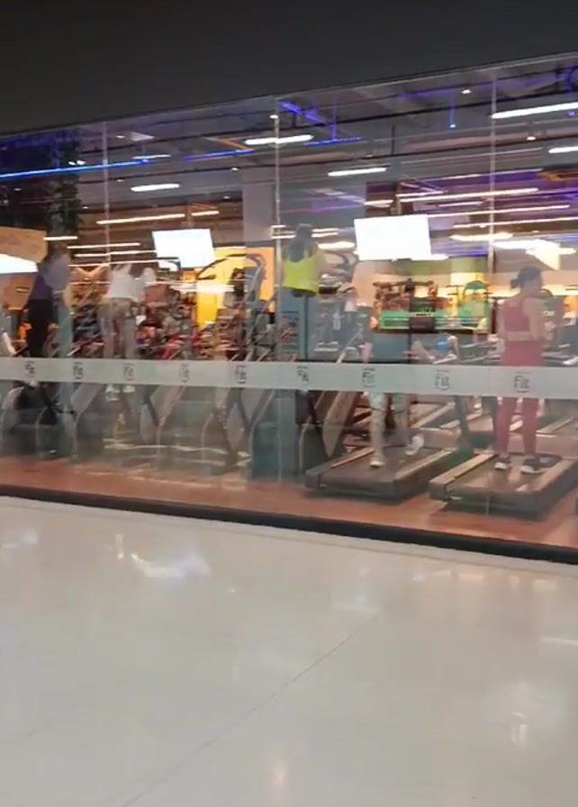 gym from outside, seen through a glass wall. People are walking on treadmills inside the gym. The gym appears to be located inside a shopping mall or similar commercial building due to the white tile floor visible outside the glass wall and a yellow and red pipe running horizontally along the ceiling. There are multiple treadmills occupied with people exercising at different speeds. The gym's name "Fit" is displayed on the glass wall. The lighting inside the gym is bright, with several monitors visible above the treadmills.