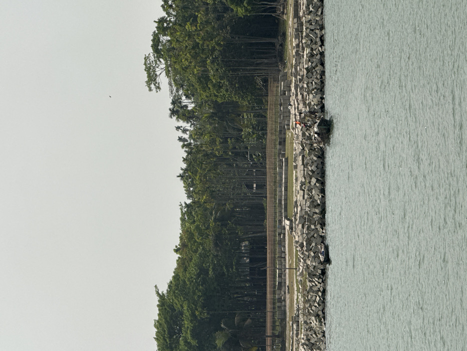 view from a boat in the water looking toward a shoreline in Harni, Bangladesh (latitude: 22.861, longitude: 90.614). The shoreline is composed of a large collection of concrete blocks. A small boat with two people in it is anchored near the shoreline. Behind the concrete blocks is a densely forested area. The sky is mostly gray and overcast. The water is calm and reflects the overcast sky.