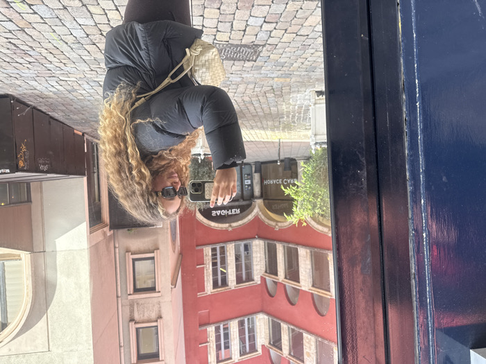 The image displays a reflective view of a woman taking a selfie in the Cour des Voraces, Croix-Rousse district, Lyon, France