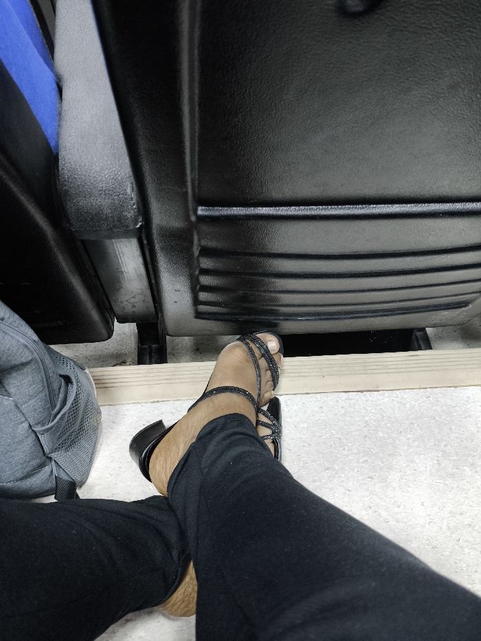 The image, taken in Kızılbaş, Northern Cyprus / Cyprus, shows a low-angle view from a seated perspective. In the foreground, a person's legs, clad in black trousers, are crossed at the ankles. The visible foot wears a black open-toed sandal featuring multiple thin, textured straps across the forefoot and around the big toe, with a low block heel. The skin on the exposed foot and ankle is tan. To the immediate left, a portion of a grey fabric backpack is visible on the floor. A light-colored wooden or plastic plank runs horizontally across the floor in front of the person's feet. The floor is light-colored and speckled. In the background, the lower rear sections of two dark, textured seats, likely synthetic material, are visible, featuring horizontal ribbed detailing. A dark vertical support structure is discernible between the two seats.