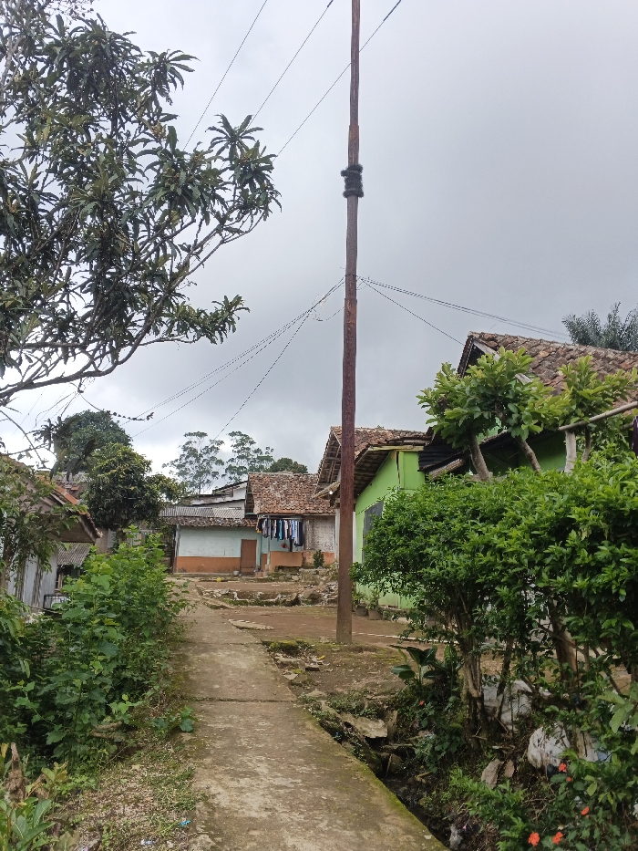 The image depicts a residential scene in Pinnwe, Myanmar (Burma), under an overcast sky. A concrete path, approximately 1.5 meters wide, traverses the foreground and extends into the midground, bordered by dense green foliage on both sides. To the immediate right of the path, a narrow, dark-bottomed channel is visible. In the midground, a tall, slender wooden utility pole stands centrally, secured with a dark, wrapped binding approximately two-thirds of the way up. Multiple thin overhead wires radiate from this pole. To the left of the pole, a large tree with dark green leaves partially obscures the sky. On the right side of the path, a house with a vibrant green painted facade and a reddish-brown tiled roof is partially visible, fronted by green bushes. Further along the path, in the background, another house with a light blue and orange-brown lower facade and a reddish-brown tiled roof features clothing hanging on a line outside. Additional houses with similar tiled roofs are scattered throughout the background. Distant, lighter-colored trees are visible on the horizon above the structures. No individuals or animals are present.