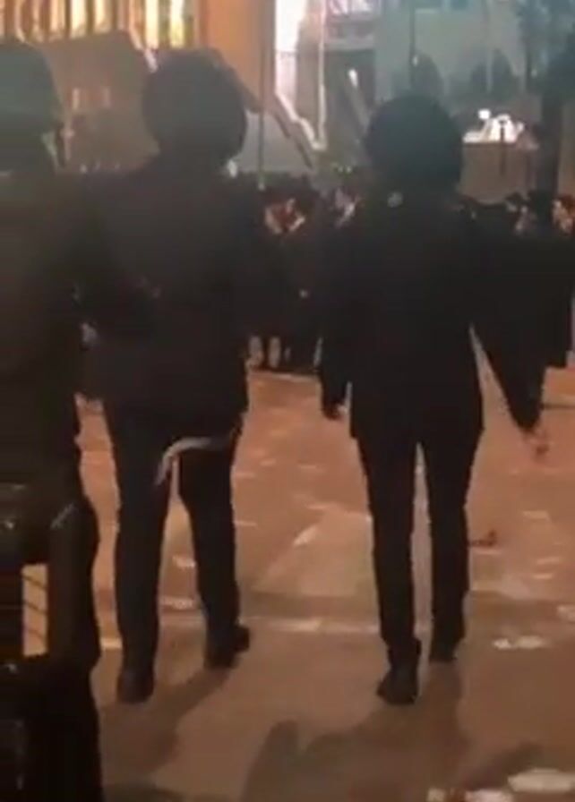 Two men in black suits and hats walk through a street crowd toward other men wearing similar attire. The street is littered with scraps of white paper, and buildings are visible on either side. There are some bicycles in the background. The video is shot from behind the two men, showing them walking away from the camera.