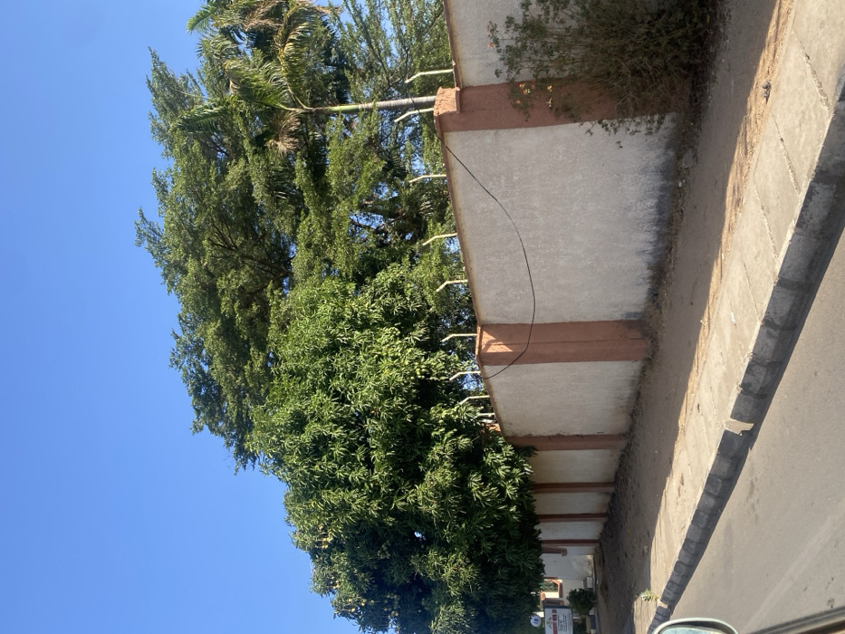 This image depicts a street view in Barnawa, Nigeria, under a clear blue sky. The central feature is a long, light-colored textured wall, approximately two meters high, reinforced by vertical brown/orange pillars at intervals. The top of the wall is fitted with white, conical security spikes. A black cable is strung horizontally along the wall between two pillars. To the left of the frame, behind the wall, a dense green mango tree with visible fruit extends upwards, partially obscuring a small white sign with red lettering. To the right, a dry shrub grows at the base of the wall. Above the wall, a dense canopy of large green trees is prominent, including a tall, slender palm tree on the right. In the immediate foreground, a grey paved sidewalk with a distinct curb runs parallel to the wall, bordering a darker paved road. A partial view of a vehicle's side mirror is visible in the bottom-left corner, indicating the perspective from a moving or parked vehicle. No people are present, and no discernible actions or interactions are taking place. The scene is brightly lit by natural sunlight.