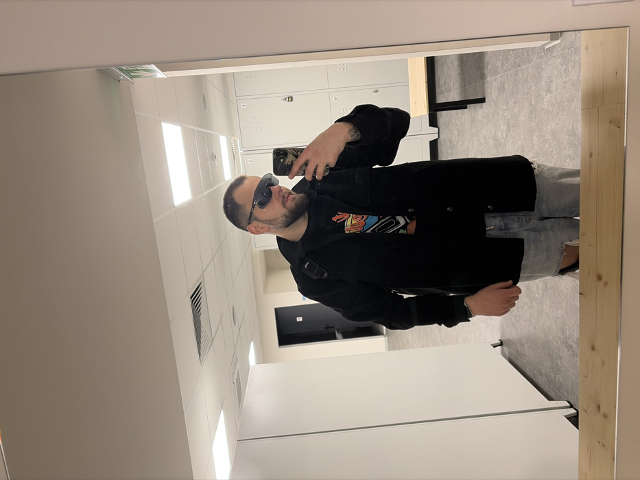 A male individual is depicted in a mirror selfie taken within an indoor facility resembling a changing room or locker room. The subject has short dark hair, a beard, and wears dark wraparound sunglasses. He is dressed in a black long-sleeved overshirt, a dark t-shirt with a colorful graphic design, and light blue ripped jeans. His right hand holds a smartphone with a camouflage-patterned case, positioned to capture the reflection. A tattoo is visible on his right inner forearm. The background shows white modular lockers, some with numeric labels (e.g., "01"), a light wooden bench with dark legs, white walls, a grey tiled floor, and a white modular ceiling equipped with recessed rectangular LED lights and ventilation grilles. A dark doorway is present in the distant left background, and another white storage unit or locker bank is visible on the left. The precise location within Plovdiv, Bulgaria, is not discernible from the provided image.