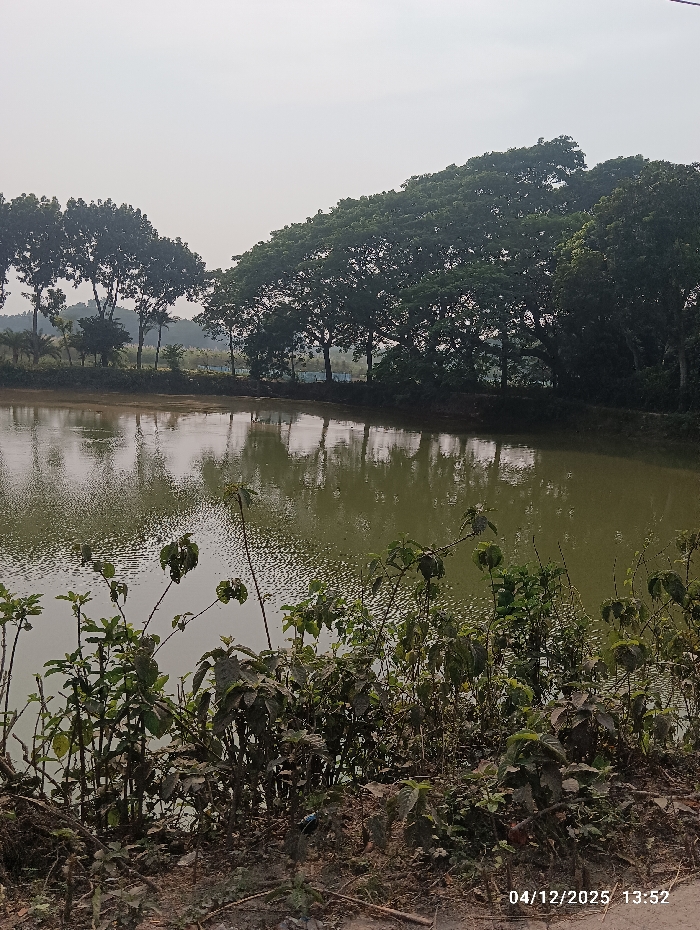 This image depicts an outdoor scene in Kaliganj, Bangladesh, captured on 04/12/2025 at 13:52. The foreground consists of reddish-brown earth sparsely covered with dry leaves and green leafy vegetation, including small shrubs. A small blue plastic object is partially visible among the plants on the lower-left. A body of calm, greenish-brown water occupies the midground, reflecting the overhead sky and trees, exhibiting subtle surface ripples. The background features a dense line of mature, dark green deciduous trees forming the far bank of the water, with their reflections visible in the water. Further left, additional taller, slender trees are observed behind the primary treeline. The sky is bright and appears uniformly light gray or pale blue, indicative of an overcast or hazy atmospheric condition. No human subjects, animals, or specific activities are present within the frame.