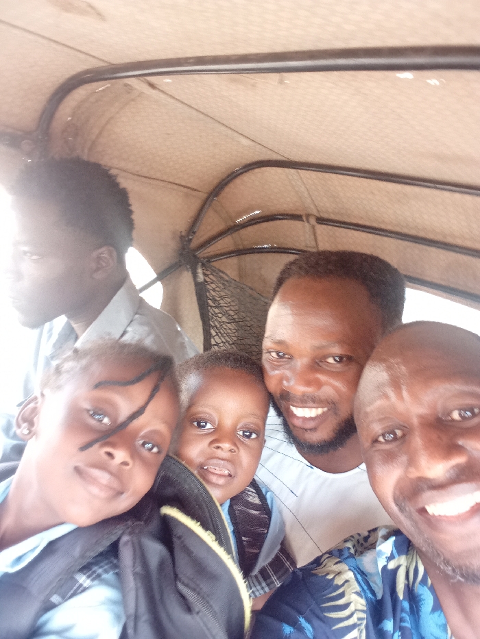 The image depicts five individuals, four in the foreground and one partially obscured in the background, inside the interior of a light-colored, fabric-covered vehicle, likely a three-wheeled auto-rickshaw, characterized by dark metal frame structures and a patterned canopy. The location is the city of Unknown, Unknown. In the foreground, from right to left: An adult male with a dark complexion, short dark hair, and a beard wears a blue shirt with a floral or leafy pattern. He is smiling broadly and looking directly at the camera. Adjacent to him is another adult male with a dark complexion, short dark hair, and a beard, wearing a white t-shirt with thin black horizontal stripes. He is also smiling directly at the camera. To their left, a young female child with a dark complexion and dark hair in braids wears a light blue uniform top and carries a black backpack with yellow trim over her shoulder. She is looking at the camera with a slight smile. Next to her, a young child of indeterminate gender with a dark complexion and short dark hair wears a light blue uniform top over a plaid shirt and appears to have a backpack. This child is looking at the camera with a slight smile and mouth slightly open. In the left background, an adult male with a dark complexion, short dark hair, and a light-colored collared shirt is partially visible. He is looking towards the left, away from the camera. The four individuals in the foreground are posing for a close-up photograph, likely a selfie, with expressions ranging from broad smiles to subtle smiles. The vehicle's interior is brightly lit, suggesting an outdoor daytime setting. A black mesh net is visible in the upper right section of the vehicle's interior.