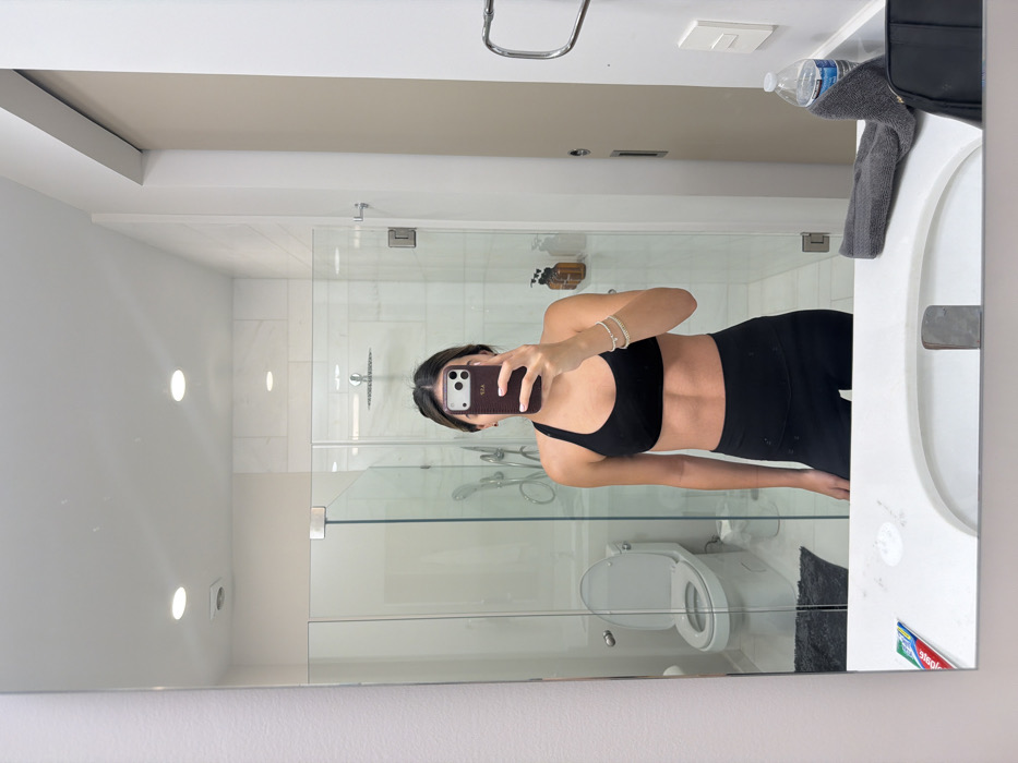 The scene depicts a mirror selfie taken by an individual in a modern bathroom located in San Pedro Garza García, Mexico. The subject, a person appearing to be female, stands centered in the reflection, clad in a black sports bra and black high-waisted leggings, revealing visible abdominal muscle definition. The individual holds a brown, textured-case smartphone in front of their face, obscuring facial features, and wears two silver-colored bracelets on their left wrist. The bathroom features a white countertop with an integrated sink and a metallic faucet. To the viewer's left on the counter, a tube of Colgate toothpaste is visible. To the viewer's right on the counter, a dark gray folded towel, a clear plastic water bottle with a blue cap, and a black bag are present. Behind the subject, a glass shower enclosure reveals a white toilet with its lid open, positioned on a dark bath mat. Inside the shower, chrome shower fixtures, including a rainfall showerhead, and three amber-colored bottles on a shelf are visible. The bathroom's interior features white tiled walls, recessed ceiling lights, and a ceiling vent. A white wall with a chrome towel bar and an electrical outlet or light switch is visible on the far right.