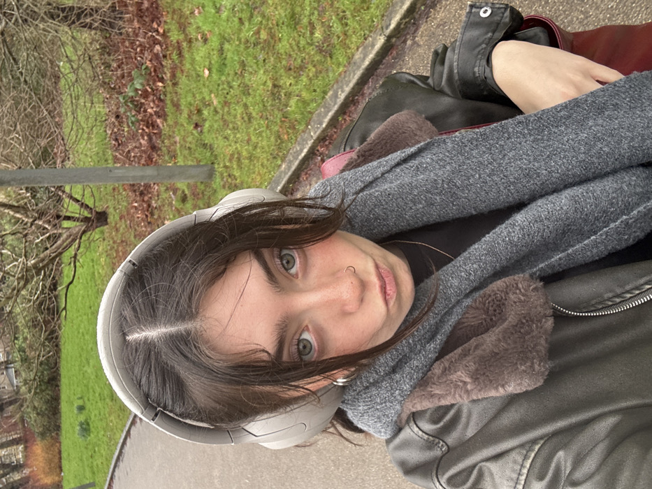 A forensic examination of the image reveals a young female posing for a selfie outdoors in the City of Hull, United Kingdom. The subject, likely in her late teens or early twenties, has dark brown hair parted down the middle, light-colored eyes, and visible freckles. She wears a nose ring in her left nostril and a silver hoop earring in her left ear. Over-ear headphones, light grey in color, rest on her head. Her attire consists of a dark top, a dark grey knitted scarf, and a dark (possibly olive green or black) leather-look jacket featuring a brown faux-fur collar. A reddish-brown bag or strap is partially visible on her right side. She looks directly at the camera with a slight pout. The background shows a paved pathway along the left, bordering a green grassy area. Scattered brown leaves are present on the grass. Several bare-branched deciduous trees are visible in the mid-ground and background, along with a grey utility pole or lamppost. The scene is illuminated by overcast natural light, consistent with a cold season.