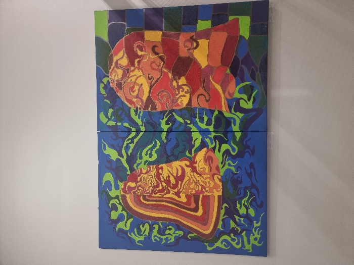 - "The image displays a diptych artwork mounted on a plain, light-colored wall, likely indoors in Jaunmārupe, Latvia" by FM-eDsUh1, licensed under CC BY 4.0