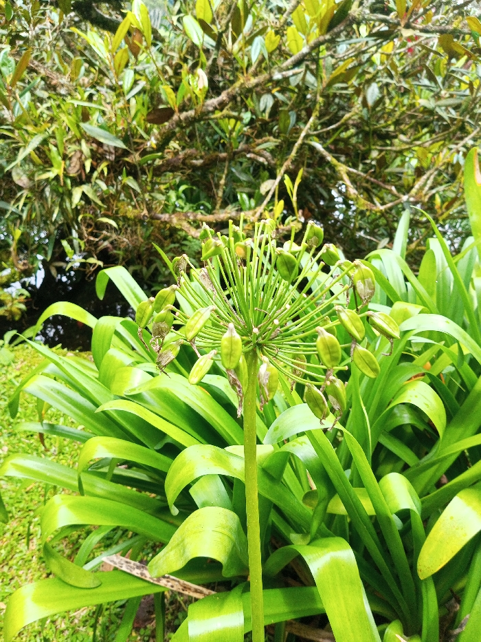 An outdoor scene in Pachmarhi, India, depicts a mature green Agapanthus plant, or similar species, in the foreground and midground. A single, upright green stalk, centered in the frame, culminates in a spherical cluster of numerous green, ovate seed pods, many exhibiting brownish tips indicative of maturation. The base of this stalk is surrounded by a dense growth of broad, strap-like, vibrant green leaves. In the background, a thick canopy of trees and shrubs with smaller green leaves is visible, featuring gnarled branches. A patch of green grass is faintly visible at the lower left. The scene is illuminated by natural light. No human or animal subjects are present.