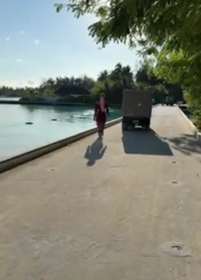 The scene shows a sunny, outdoor location with turquoise water. A woman in a dark outfit and headscarf is walking on a light gray concrete path that runs along the water's edge. The sun is bright, causing lens flare through the branches of a tree on the right. Next to the woman, on the path, is a small, boxy utility vehicle. Vegetation and buildings are visible in the distance.