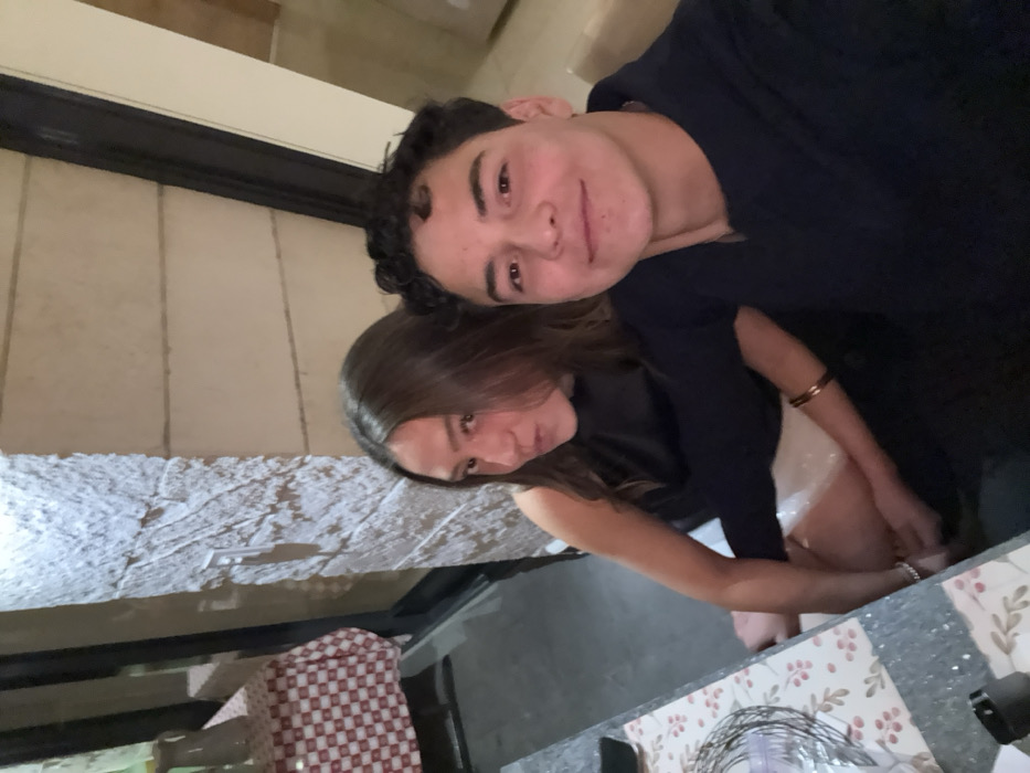 Two young people, a male and a female, pose closely together. The male has dark hair and a light complexion. He wears a dark-colored top. The female has long, brown hair and also wears a dark top, with light-colored clothing underneath. The background is a mix of indoor elements, including a textured wall, patterned surfaces, and furniture covered in a red and white checkered pattern. The overall lighting suggests an indoor setting, likely taken in a casual environment.