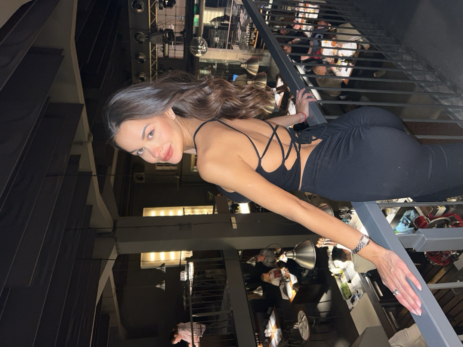 An indoor scene within Grad Restaurant, located in the Beton Hala complex at Karađorđeva 2-4, Belgrade, Serbia, depicts a young adult female on a mezzanine level, facing the viewer. She has long, dark, wavy hair and fair skin, and exhibits a slight smile. She wears a black, form-fitting, sleeveless crop top with a criss-cross lace-up back and black, high-waisted, form-fitting trousers featuring ruching detail on the rear. Her left forearm rests on a dark metal railing; a square-faced wristwatch with a metal band is visible on her left wrist, along with a ring on her left ring finger. The background reveals the lower level of the restaurant, characterized by a dark, industrial aesthetic with exposed overhead beams and ambient lighting. Approximately ten dining tables, some occupied by patrons engaged in dining or conversation, are visible. Large, silver, industrial-style pendant lamps illuminate the tables. An open kitchen or bar area is present on the lower level, featuring a counter with various items including bottles and kitchen equipment.