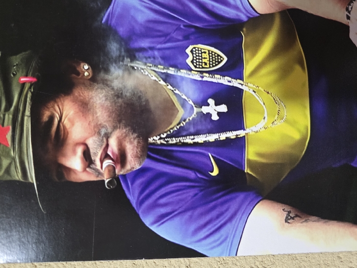 An adult male individual is depicted from the chest up, positioned against a dark, indistinct background. He wears an olive green military-style cap featuring a red five-pointed star emblem on the front, with a small red clip or pin attached to the right side. His face shows stubble or a short beard, and he has two small, white stud earrings in each earlobe. A lit cigar is held between his lips, with a plume of smoke visibly rising from it. He is wearing a dark blue/purple short-sleeved football jersey, distinguished by a horizontal yellow stripe across the chest. A yellow Nike swoosh logo is present on the upper right chest, and an emblem with the letters "CABJ" is visible on the upper left chest. Multiple silver-colored chains are draped around his neck, with a prominent silver-colored cross pendant hanging from one. A dark-colored tattoo, depicting an abstract or animalistic figure, is visible on his right bicep. The scene is located in Villa San Andrés, Argentina.