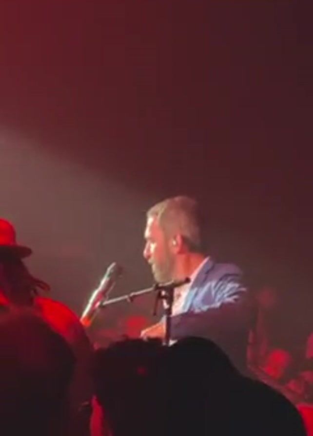 man in a blue suit playing a keyboard at a concert. The stage is bathed in red light. The man is standing in front of a microphone stand. Other people are visible in the crowd.