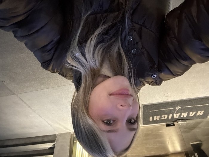 A woman with blonde-streaked hair is wearing a black puffer jacket. She is facing the camera with a slight smile. A doormat with "HANAICHI" printed on it is visible behind her. The flooring is made of light-colored tiles or concrete. The photo is oriented upside down.
