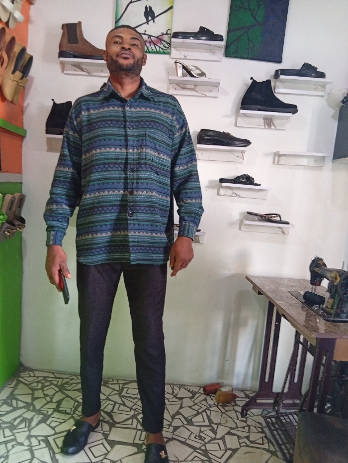 A man stands in a room displaying shoes on shelves. He wears a patterned blue and green shirt with dark slacks and loafers. In his hand, he holds a phone. The floor is tiled with a geometric pattern. A sewing machine sits on a table in the background. Artwork, including a painting of birds, adorns the wall behind the shoes.