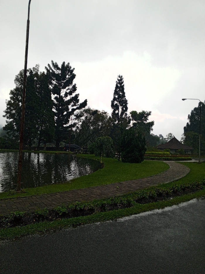 A tranquil scene unfolds with a lake reflecting dark trees under a cloudy sky. A brick pathway curves along the grassy edge of the water, leading to a small building with a dark roof nestled among more trees in the distance. Two street lamps stand on either side of the frame, adding to the still, overcast atmosphere. The foreground features a wet road, suggesting a recent or ongoing rainfall.