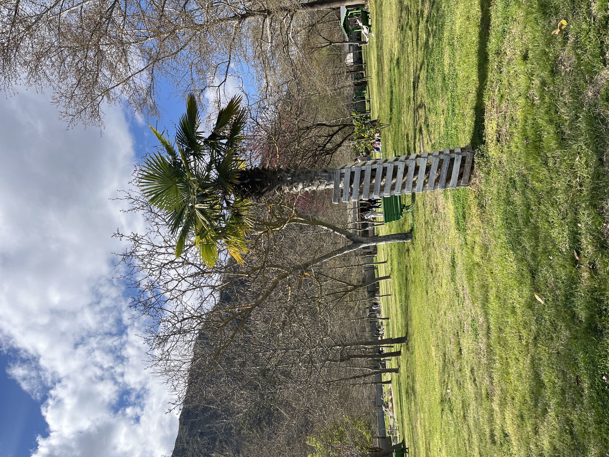 The image depicts a park scene in General Todorov, Bulgaria. A palm tree stands in the foreground, its trunk surrounded by a wooden fence. The lawn is green, and rows of deciduous trees line the middle ground. A mountain slope rises in the background, under a sky with clouds and patches of blue. In the park, small groups of people are seated on benches.