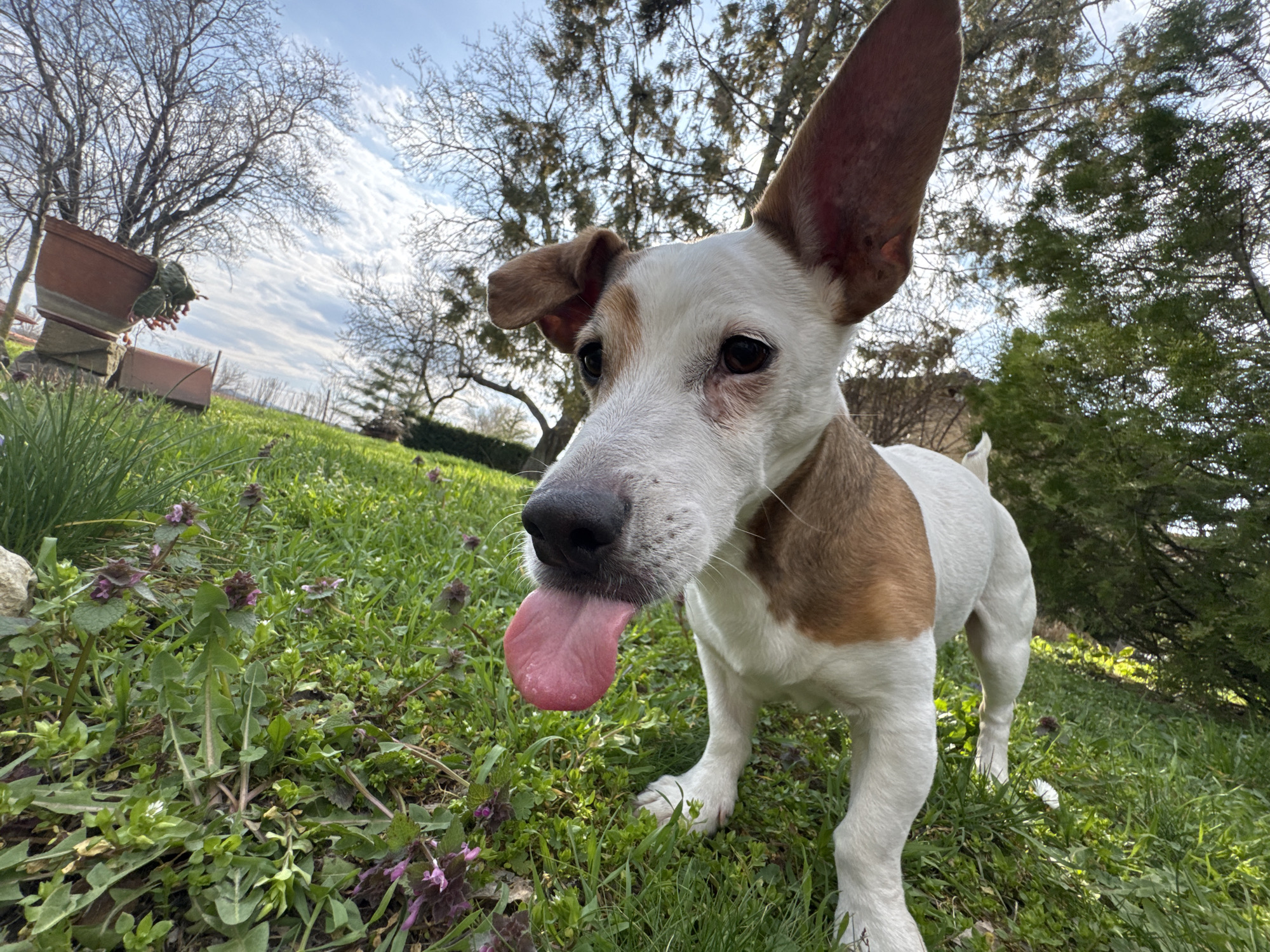 A low-angle forensic image depicts a small dog, possibly a Jack Russell Terrier mix, standing in a grassy area in Sandrovo, Bulgaria. The dog is primarily white with brown patches on its right ear, left side of its head, and a larger patch on its body visible on the right. Its left ear is fully erect and brown, while the right ear is partially folded back and also brown. The dog's snout is dark, and its pink tongue is extended downwards and slightly to the left, indicating a possible panting or licking action. Its dark eyes are visible, looking slightly to the left of the frame. The foreground consists of green grass with various small plants, including broadleaf weeds resembling dandelions, and clusters of small purple flowers. A few smaller white flowers are also present. In the mid-ground, to the left of the dog, two terra cotta-colored planters are visible, stacked and appearing discarded or stored. One is tilted, showing green foliage hanging from it. The background features multiple trees. To the left and center, deciduous trees with bare branches are visible against a bright blue sky with wispy white clouds. To the right, evergreen trees with dense green foliage are present. The overall lighting suggests an outdoor scene during daylight hours. No human subjects are visible.