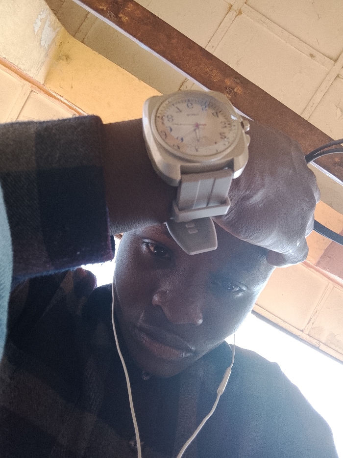 A low-angle selfie depicts a dark-skinned individual in an indoor setting, identified as the city of Toro, Nigeria. The person looks directly into the camera, wearing a dark plaid long-sleeved shirt. A large, light-colored wristwatch with a matching, ribbed strap and Arabic numerals is prominent on their left wrist. White wired earphones are visible, with one earbud positioned in the left ear. The background consists of an overhead ceiling structure featuring light-toned panels with visible peeling paint and dark, discolored horizontal beams.