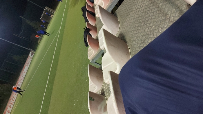 This image captures an illuminated artificial turf football pitch at night, viewed from a spectator stand in Gorna Oryahovitsa, Bulgaria. In the immediate foreground, the upper legs of an individual, clad in dark blue fabric, are visible. Directly in front of the viewer, a row of approximately ten light beige plastic stadium seats is arranged on a metal frame, positioned over a raised platform with a diamond-patterned metal surface. Several black fabric items are draped over seats further down the row, and a partial green 'Monster Energy' logo is visible on one seat. The green artificial turf field is brightly lit by unseen overhead sources, featuring distinct white lines. Multiple individuals are on the field; most wear dark blue athletic wear, with at least two subjects prominently in orange tops. Two figures, one in a blue top and one in an orange top, are in motion on the left side of the field. A football goal with a net is visible on the right side of the pitch. Along the field's perimeter, a white advertising banner displaying the word "PRITY" in red lettering is discernible. A dark fence and the outlines of trees are visible against the night sky in the background.