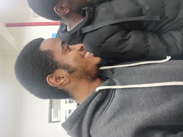 Two men are pictured indoors, one behind the other. The man in the foreground wears a gray hooded sweatshirt with white drawstrings, his head turned to the right, displaying a wide smile. Behind him, another man wears a black puffer jacket. The background includes a white wall with a red stripe and a window with a white frame. The overall lighting appears to be bright and even.