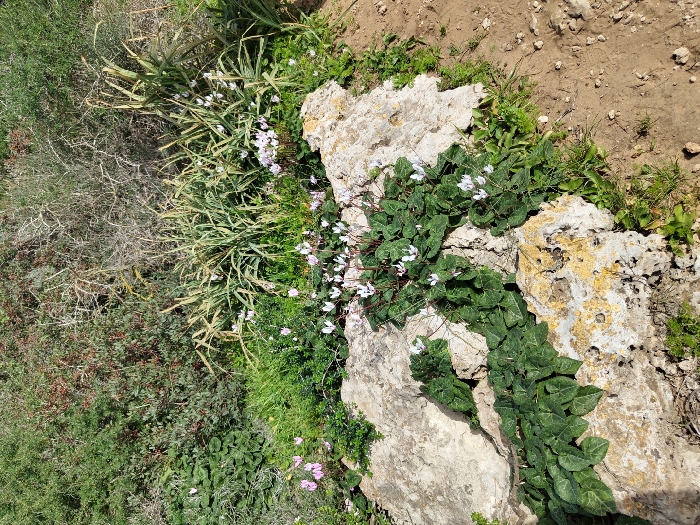 The image displays an outdoor natural landscape within the Hof HaCarmel Regional Council, Israel. The foreground features several light-colored, textured rocks, some exhibiting patches of yellow and orange lichen. Dark green, broad-leaved plants grow over and around these rocks. Numerous small cyclamen flowers are visible, predominantly white with a scattering of pink variants, emerging from the foliage and rock crevices. To the right, a patch of light brown soil is present. The midground and background are densely populated with various green plant species, including grass-like vegetation, small shrubs, and some drier, reddish-brown brush. More white cyclamen flowers are interspersed throughout the midground greenery. The scene is illuminated by natural daylight, indicating an outdoor daytime setting. No individuals or artificial structures are depicted.