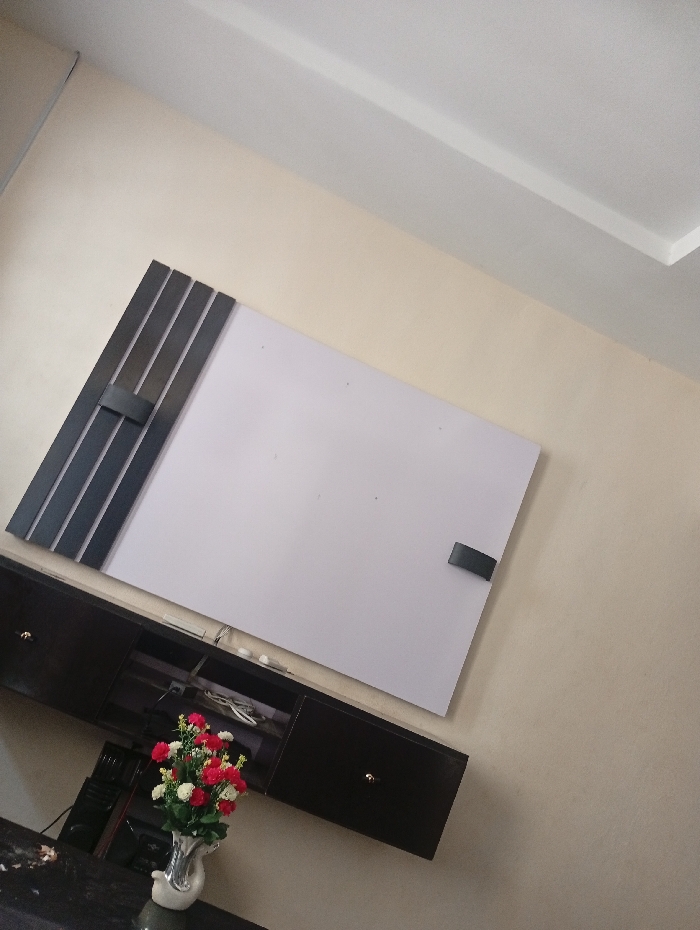 This image captures an interior scene, likely within a residence in Zango-ndaji, Nigeria. The central focus is a modern media unit composed of a dark brown wall-mounted console and a large, light-colored rectangular panel affixed to the wall above it. The console features two closed compartments with gold-colored circular knobs and an open central section containing visible white cables. To the left of the rectangular panel are four parallel vertical dark strips, and to its right, a single horizontal dark strip, acting as decorative or structural elements. Below the console, on a dark, flat surface, rests a white, irregularly shaped vase holding a bouquet of artificial flowers primarily colored red and white with green foliage. A dark electronic device is partially visible to the left of the vase. The walls are painted a uniform light beige, meeting a white ceiling with a simple molding. No individuals or specific actions are depicted.