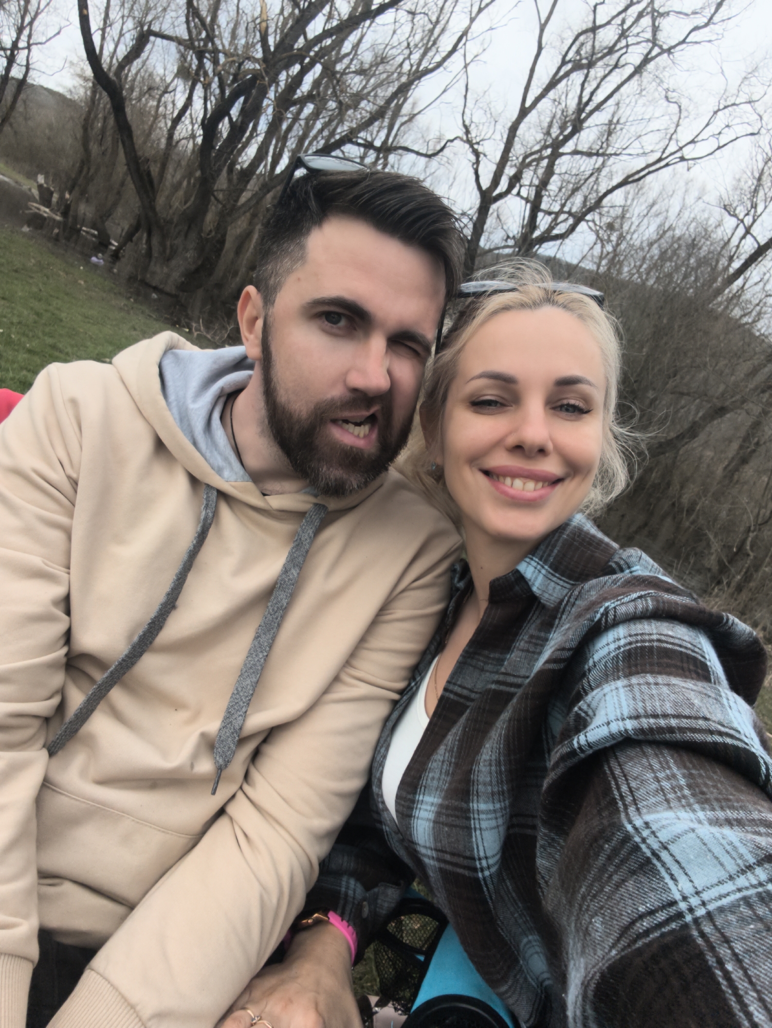A selfie shows a man and a woman outdoors in Орлиновский округ, Ukraine. The man has dark hair and a beard, and he is wearing a tan hoodie. He is winking at the camera. The woman has blonde hair and is wearing a blue plaid shirt over a white top. She is smiling. Behind them is a grassy area with bare trees. The sky is overcast.